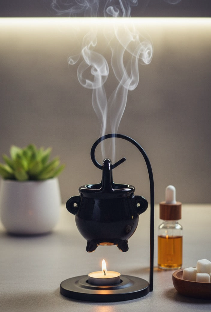 Transforma tu espacio en un refugio mágico con nuestro quemador de esencias en forma de caldero. Inspirado en las antiguas tradiciones de la brujería, este elegante objeto no solo difunde tus aromas favoritos, sino que también sirve como una pieza central para crear una atmósfera mística y relajante. El caldero cuelga delicadamente sobre un soporte de metal, listo para liberar esencias que hechizarán tus sentidos. Es la pieza perfecta para cualquier altar, rincón de lectura o simplemente para aquellos que buscan un toque de magia en su hogar."